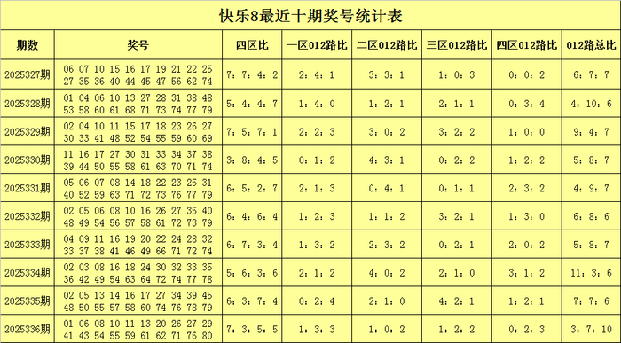 福彩快乐8第2025336期开奖回顾:01 06 08 10 11 13 20 26 27 29 41 43 54 55 59 61 62 71 76 80,其中奖号四区比为7:3:5:5,012路比为3:7:10,和值为753,跨度为79。