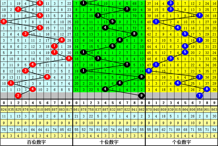 百位上期开出号码4,上升3点位,本期注意该位下降,参考号码2。