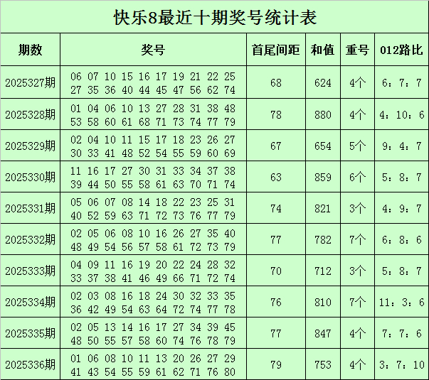 福彩快乐8第2025336期开奖回顾:01 06 08 10 11 13 20 26 27 29 41 43 54 55 59 61 62 71 76 80,其中奖号首尾间距为79,和值为753,012路比为3:7:10,包含5组同尾号码:10-20-80、01-11-41-61-71、13-43、06-26-76、29-59,开出4个重号:13、27、55、76。