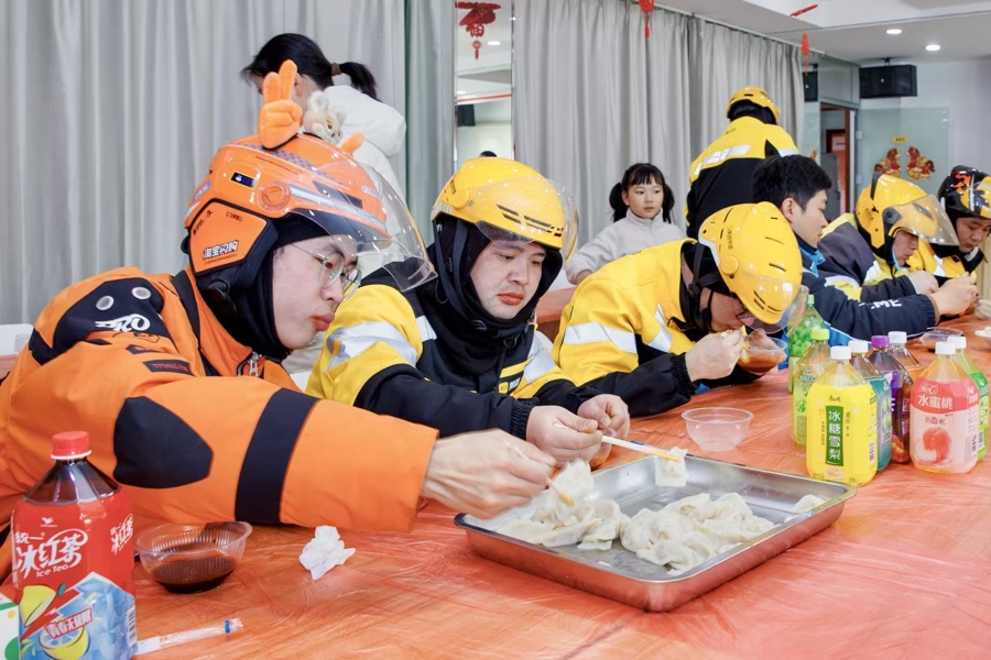 “平时风里来雨里去,过年也只能在路上赶单,没想到这里比家里还热闹、还暖心。”一位骑手捧着社工办精心准备的年夜饭大礼包由衷感慨。简单的话语里,藏着常年奔波的不易,也透着被城市温柔以待的感动。吃完热饺,骑手们自发拎起装满饺子的餐盒,把这份暖意送到辖区独居、高龄、行动不便的老人家中,让一份关怀、两份温暖,从“红色加油站”一路送至“家门口”。